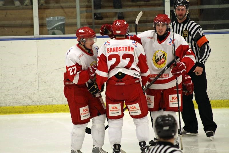 Under Onsdagen var det dags för Slaget om Södra Dalarna igen när Säter/Skedvi hade hemmaplan. Matchen började böljandes med ett piggt SSIF som såg rejält taggat ut. Utdelning fick man redan på första skottet när Jacob Larsson hittar nätmaskorna bakom William Lind. Snabb replik kommer dock när Säter-sonen Andrée Eriksson gör 1-1 och kort därefter tar även Hedemora ledning genom Joel Källström/Englund. Första perioden fortsätter att bjuda på en jämn kamp och välförtjänt kommer även kvittering 2-2 innan periodpaus i Arla Arena. Mittenperioden och Hedemora kommer upp bättre och skapar många bra lägen framför Westling i målet. Ledningsmålet kommer även ca tre minuter in i perioden när en av matchens ljusglimtar Viktor Widing gör sitt första mål för kvällen. Hedemora fortsätter efter detta spela kontrollerat och håller genom en stabil offensiv och kämpainsats resultatet in i den sista perioden. Om Hedemora va det lite vassare laget i andra, så var detta 10x bättre. Hedemora öser på på ett tröttkört SSIF och målen kommer. Med fem minuter spelade kliver backen Sebastian Varjomaa fram och sätter det så viktiga 2-4 målet. Skön comeback för Varjomaa som varit borta pga skadad en tid. Hedemora får till ett powerplay med ca åtta minuter spelade efter att Kalle Strömberg hakat en HSKare. Powerplayet förvaltas på bästa sätt och kvällens tvåmålsskytt Viktor Widing kan stiligt lägga in pucken bakom Westling och matchens känns definitivt punkterad. SSIF försöker tända laget genom en timeout men kort därefter utökar Hedemora till 2-6 genom den unge talangen Joel Källström/Englund som gör ett mycket snyggt mål när han fintar upp säterspelare på läktare och lägger pucken kyligt i krysset på en backhand. Resultatet står sig och Hedemora vänder hem med mycket sköna 3 poäng inför slutspurten innan juluppehåll. I slutskedet av matchen urartar det i slagsmål där Hedemoras #11 Samuel Blucher hamnar i slagsmål med SSIFs Kim Larsson. En fight som våran kille står som segrare i! Sammanfattningsvis en bra insats där man kommer tillbaka efter sju torskar och visar en enorm spelglädje och sliter för varandra som lag. Ärkerivalen SSIF har nu fått se sig besegrade av oss tre gånger och fler gånger ska det bli efter jul! Nu väntar derby igen redan på söndag då Borlänge HF kommer på besök i Bolidenhallen kl 16:00! Kom och stötta våra rödvita till ny seger då. Skedvi/Säters IF - Hedemora SK 2-6 (2-2,0-1,0-3) 1-0 Jacob Larsson (Johan Vilén, Albin Östman) 1-1 Andrée Eriksson (Fredrik Hagman, Rasmus Sandström) 1-2 Joel Källström/Englund (Jonas Suvanto, Olof Källström) 2-2 Staffan Elfström (Pontus Westling, Joakim Elfström) 2-3 Viktor Widing (Rasmus Sandström, Robin Holm) 2-4 Sebastian Varjomaa (Rasmus Sandström, Karl Hassel) 2-5 Viktor Widing (Rasmus Sandström, Karl Hassel) 2-6 Joel Källström/Englund (Alfredo Pettersson, Linus Westlund) Skott: 30-26 Utv.min: SSIF 37min, HSK 37min