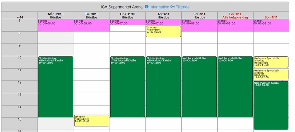 Kommunen har lagt ut tider för allmänhetens åkning under läslovet, dvs. v44. Onsdag och Söndag är det allmänhetens åkning utan klubba och puck. Övriga dagar får man använda detta. Måndag 10:00-15:00 (med klubba och puck) Onsdag 10:00-15:00 (utan klubba och puck) Torsdag 10:00-15:00 (med klubba och puck) Fredag 10:00-15:00 (med klubba och puck) Lördag 10:00-15:00 (med klubba och puck) Söndag 12:00-16:00 (utan klubba och puck) Obs. Hallen är stängd dagtid under tisdagen för service av sarg/båsdörrar.